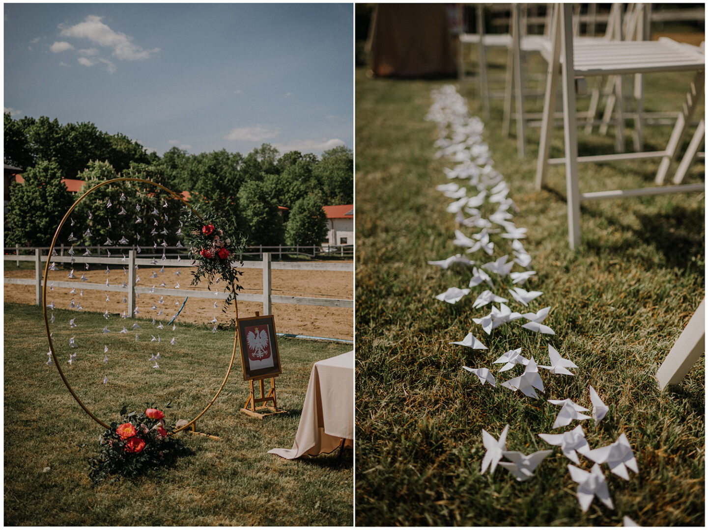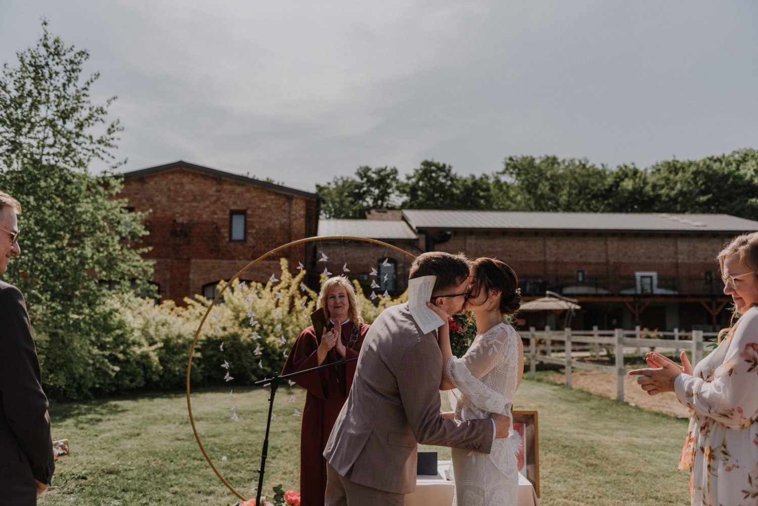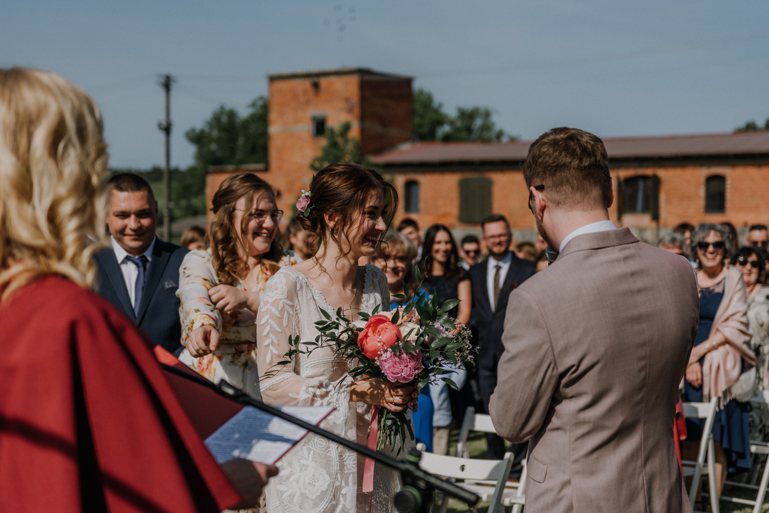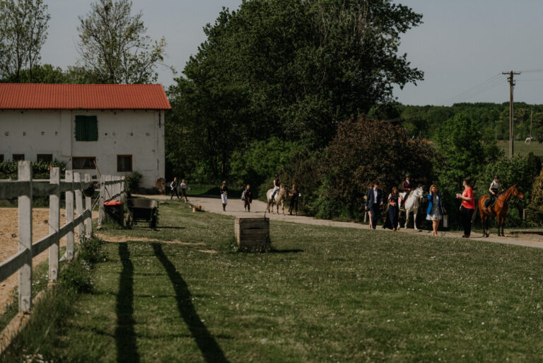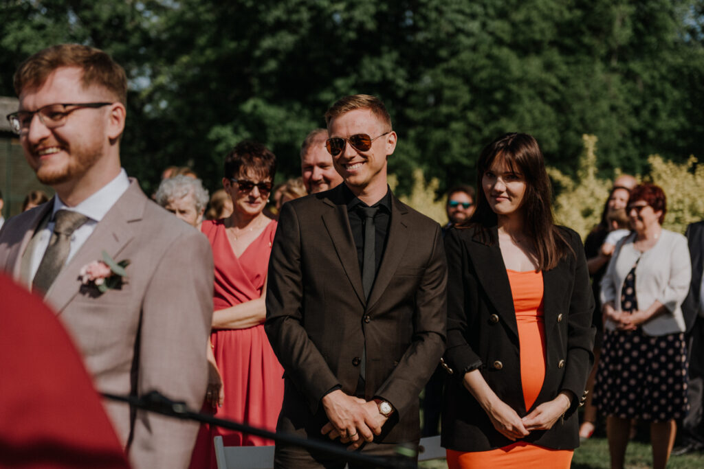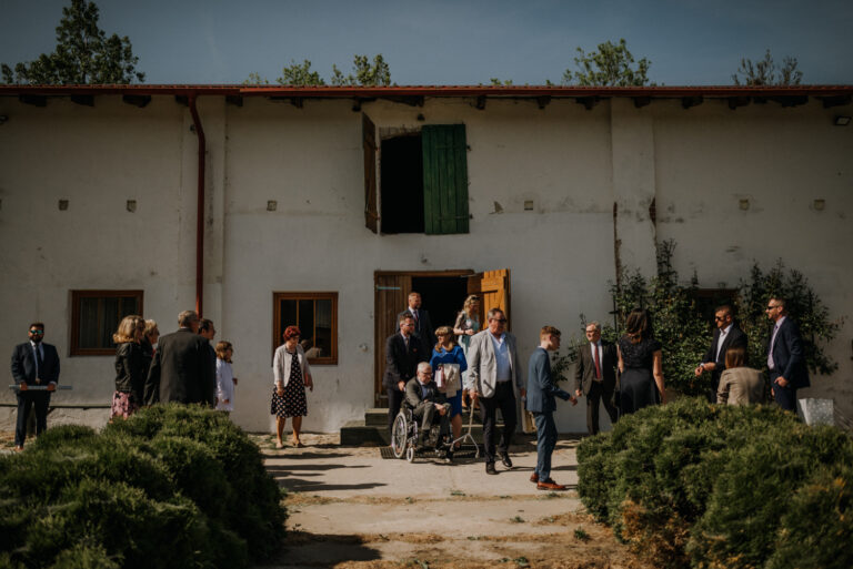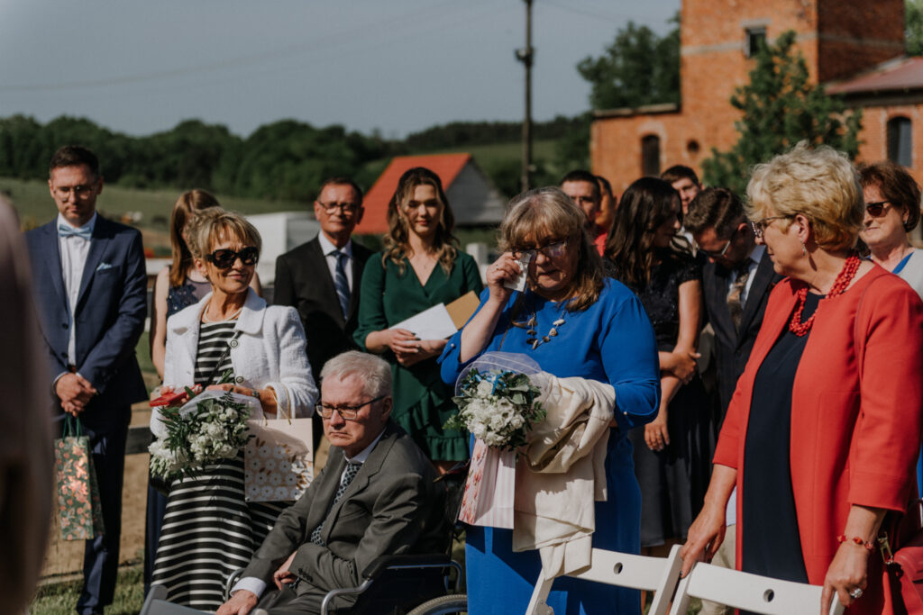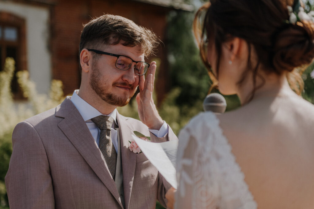 Ślub cywilny odbył się pomiędzy budynkami sali a placem jeździeckim, słońce grzało niemiłosiernie. Do dziś pamiętam gorąc jaki panował w to majowe popołudnie. A potem Monika zaczęła ze swoim tatą zmierzać do miejsca ceremonii, łzy zaczęły spływać po policzku Pana Młodego, goście nie zostali mu dłużni… gorąc przestał mieć takie znaczenie. A potem wzruszeniom nie było końca. Przeczytane własne przysięgi dodały szczypty magii, ale żartobliwe wspomnienia rozluźniły nieco atmosferę. Było pięknie!