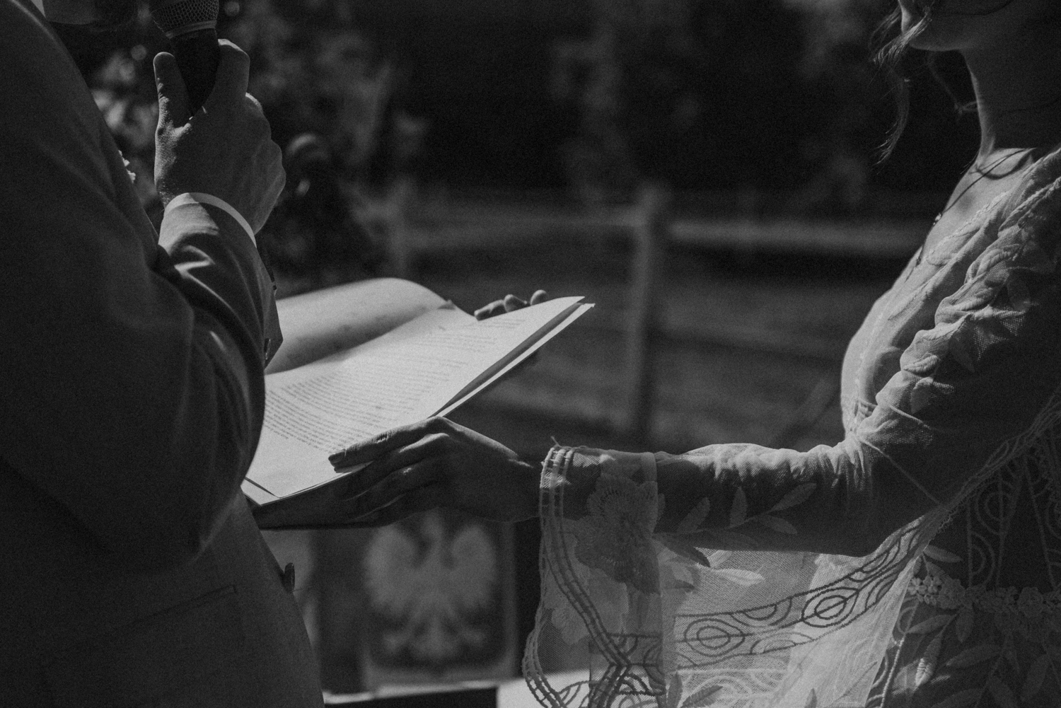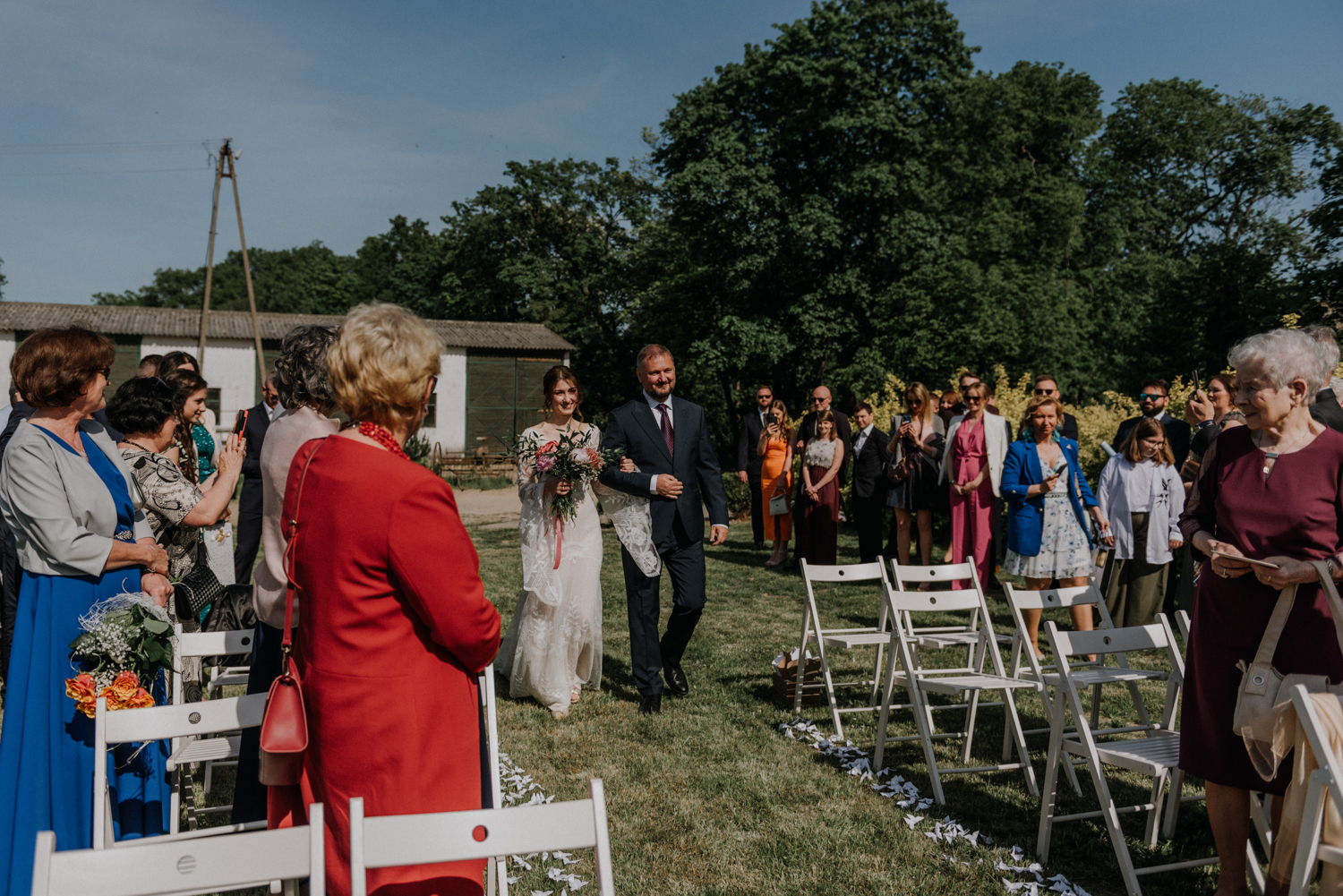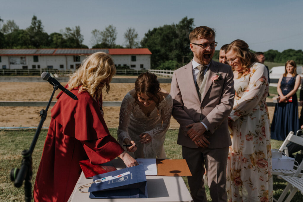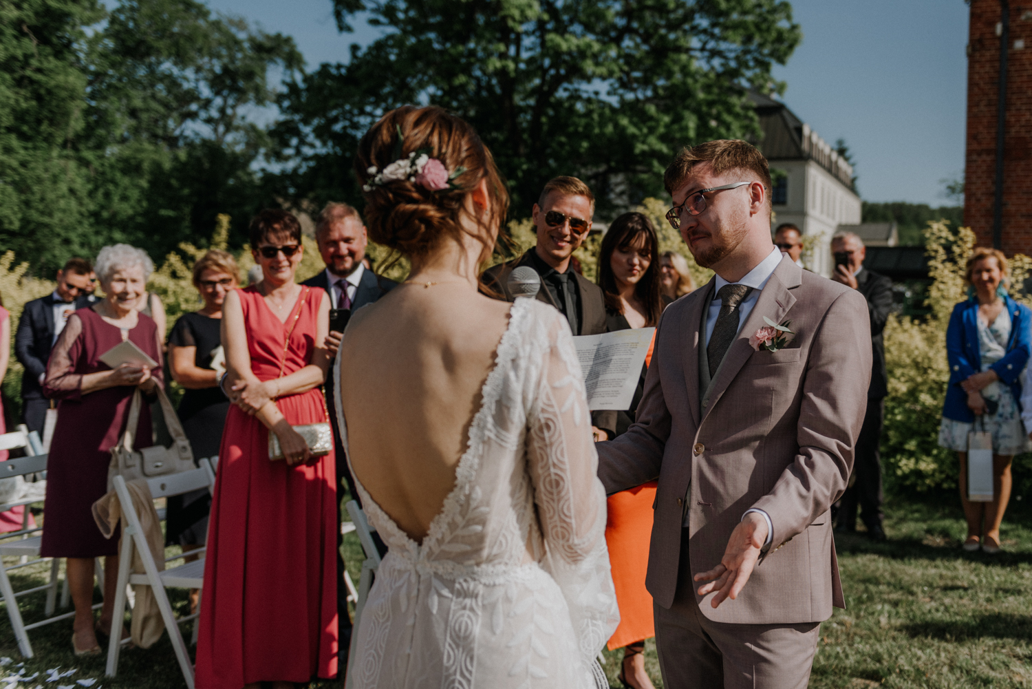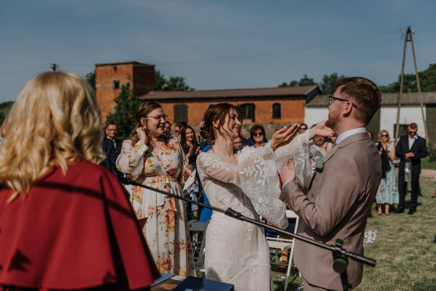 Ślub cywilny odbył się pomiędzy budynkami sali a placem jeździeckim, słońce grzało niemiłosiernie. Do dziś pamiętam gorąc jaki panował w to majowe popołudnie. A potem Monika zaczęła ze swoim tatą zmierzać do miejsca ceremonii, łzy zaczęły spływać po policzku Pana Młodego, goście nie zostali mu dłużni… gorąc przestał mieć takie znaczenie. A potem wzruszeniom nie było końca. Przeczytane własne przysięgi dodały szczypty magii, ale żartobliwe wspomnienia rozluźniły nieco atmosferę. Było pięknie!