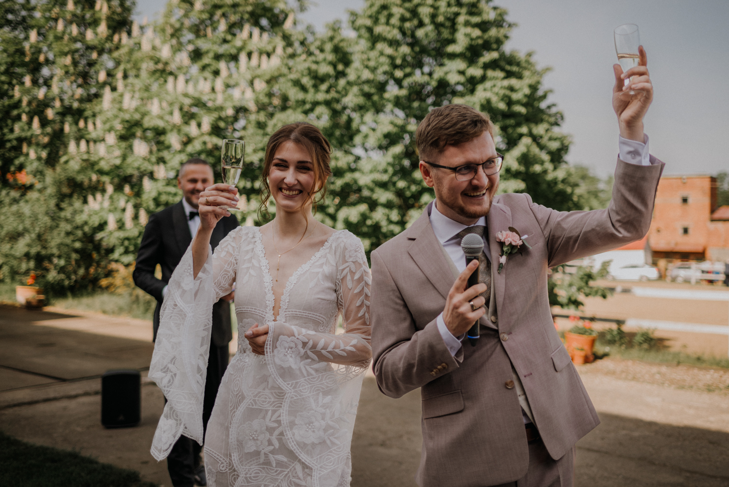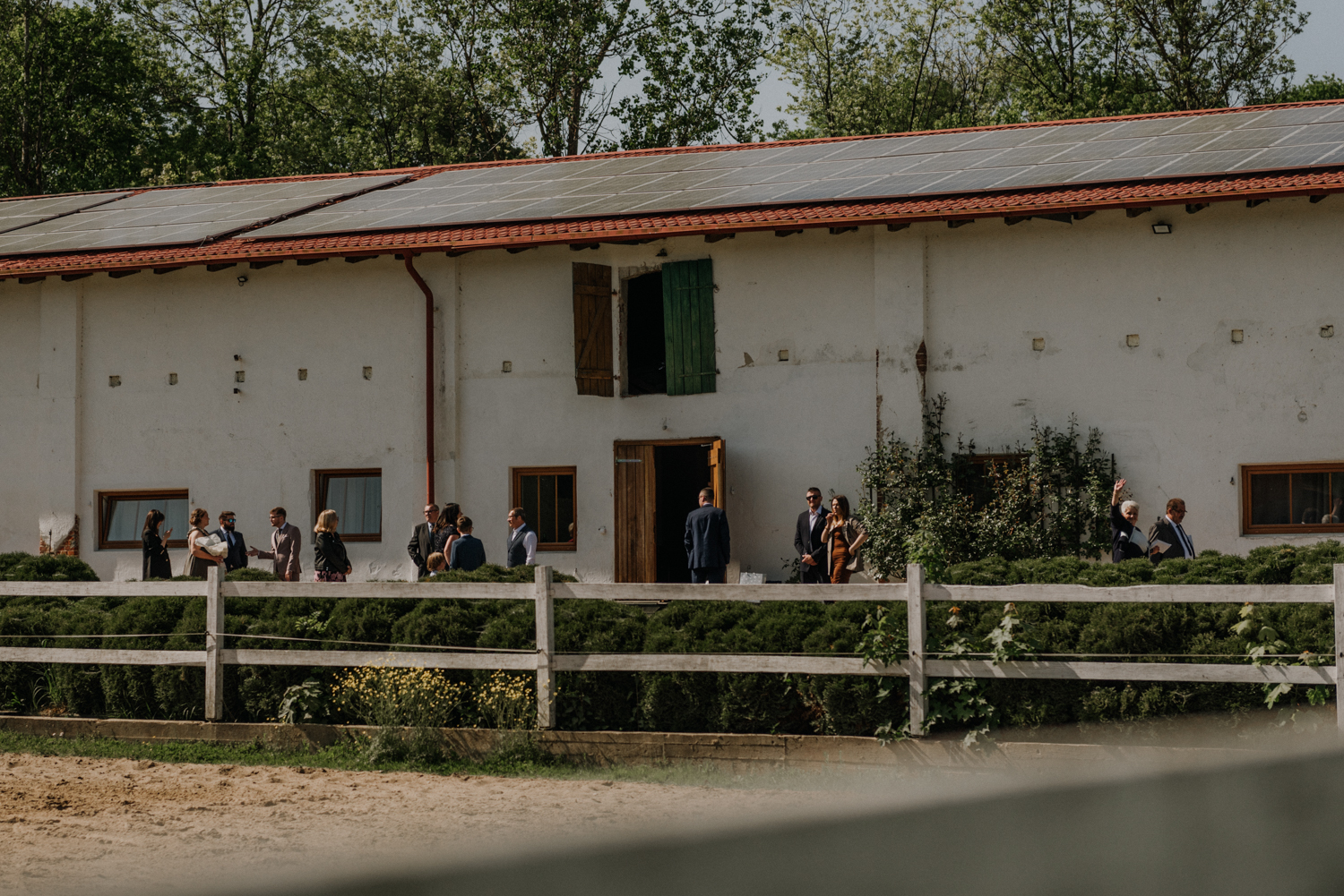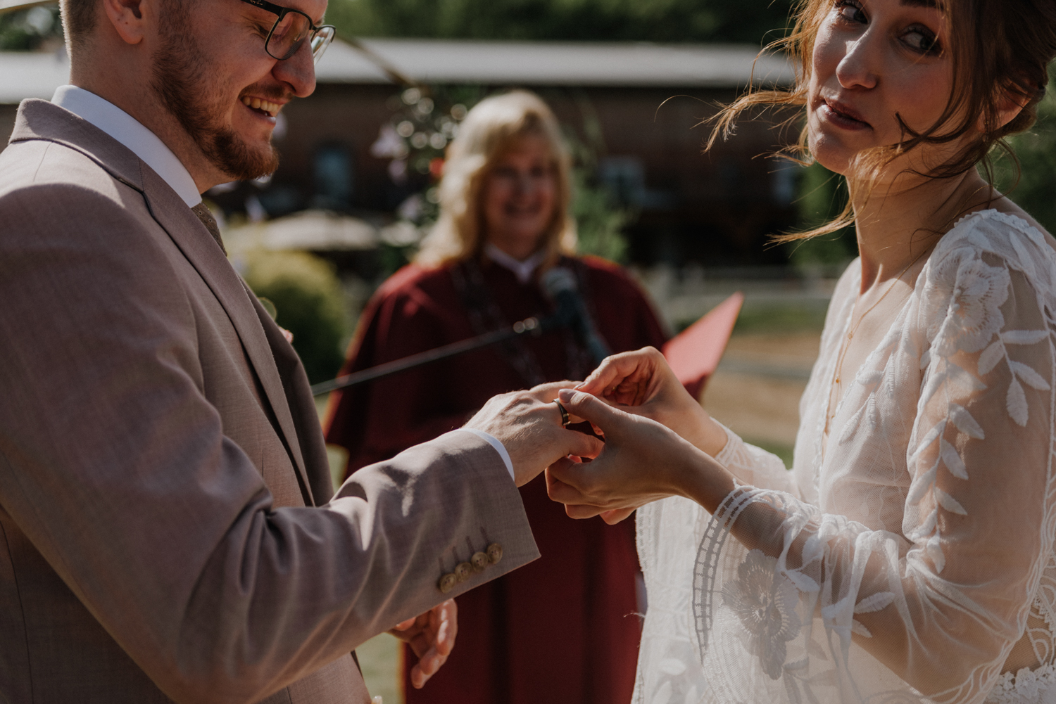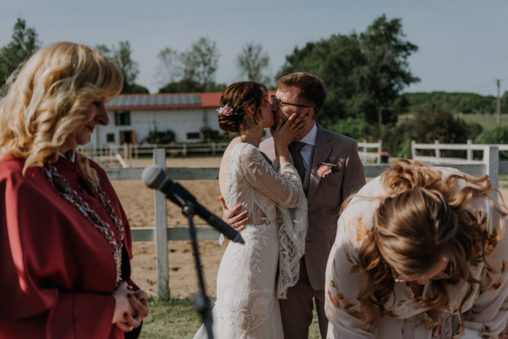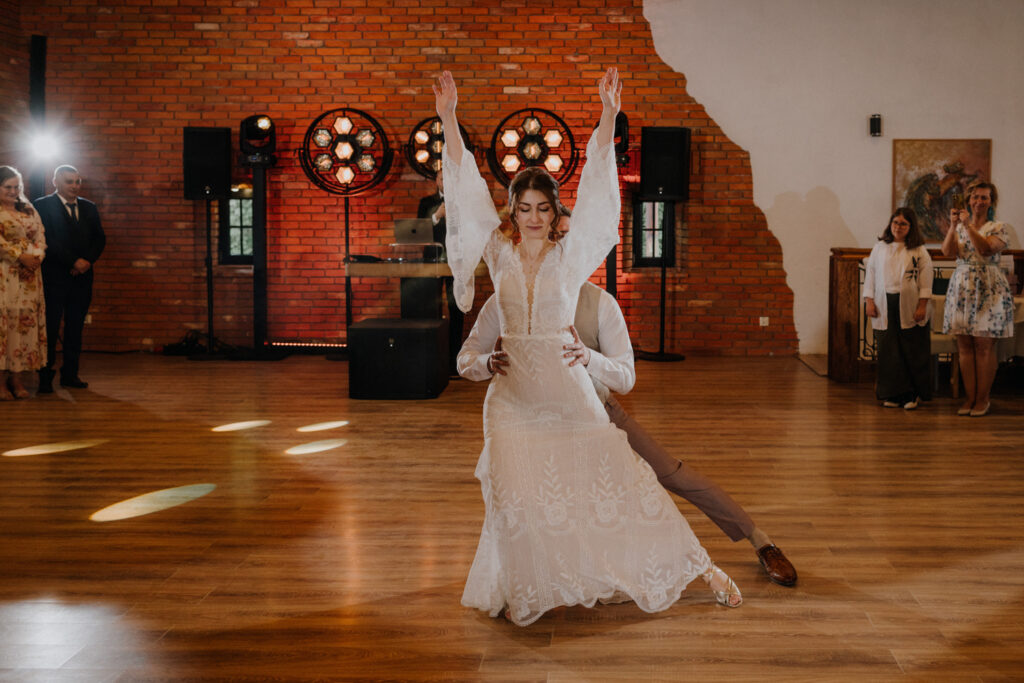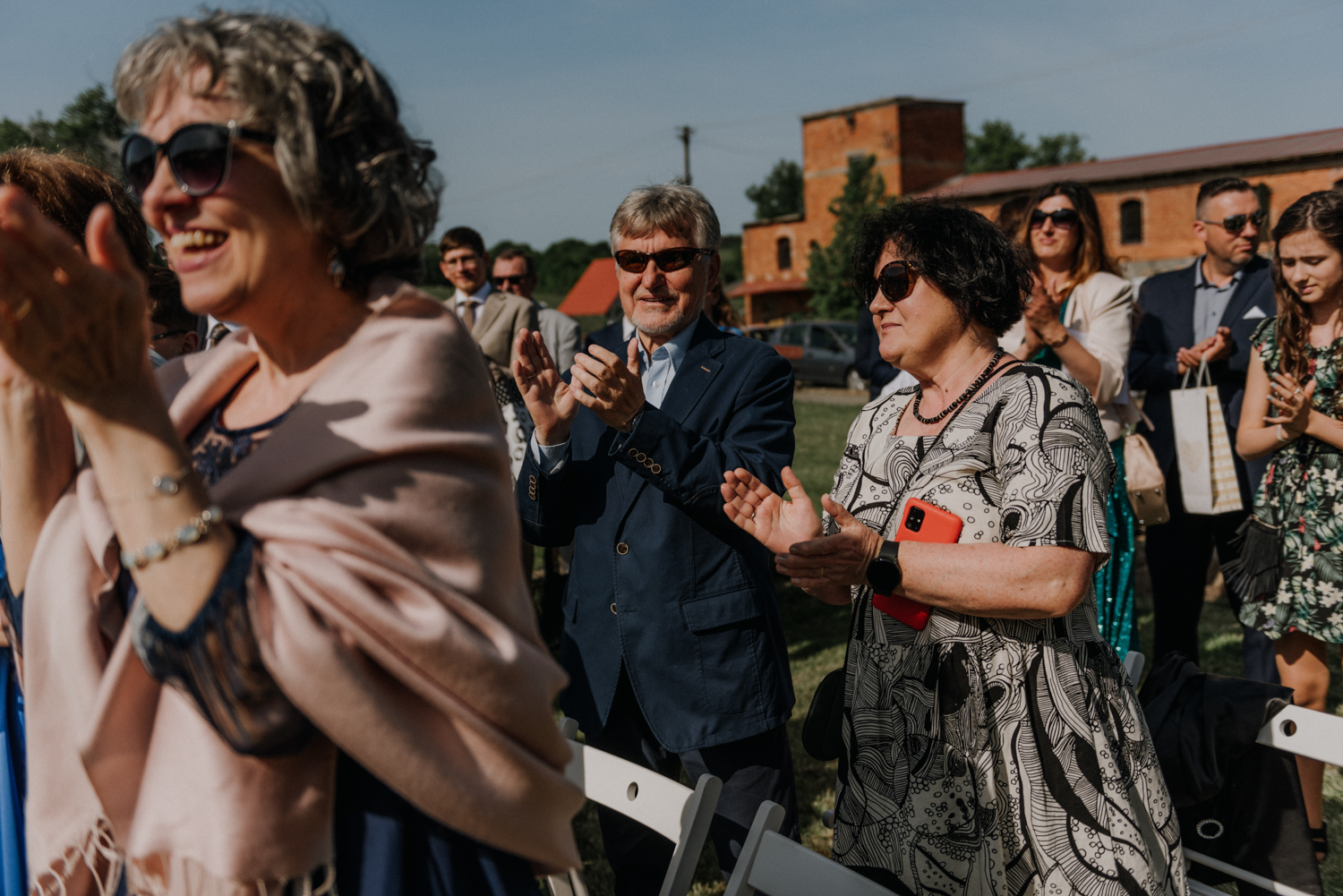 Ślub cywilny odbył się pomiędzy budynkami sali a placem jeździeckim, słońce grzało niemiłosiernie. Do dziś pamiętam gorąc jaki panował w to majowe popołudnie. A potem Monika zaczęła ze swoim tatą zmierzać do miejsca ceremonii, łzy zaczęły spływać po policzku Pana Młodego, goście nie zostali mu dłużni… gorąc przestał mieć takie znaczenie. A potem wzruszeniom nie było końca. Przeczytane własne przysięgi dodały szczypty magii, ale żartobliwe wspomnienia rozluźniły nieco atmosferę. Było pięknie!